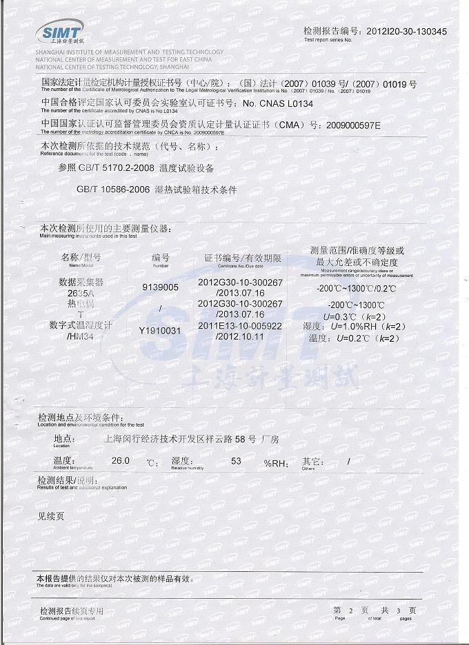 ·高低溫交變濕熱試驗箱檢測報告-上海計量院-國家光電檢測