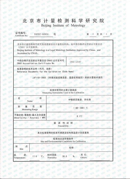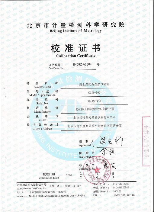 >>高低溫交變濕熱試驗箱校準(zhǔn)證書-北京計量院-拉特激光